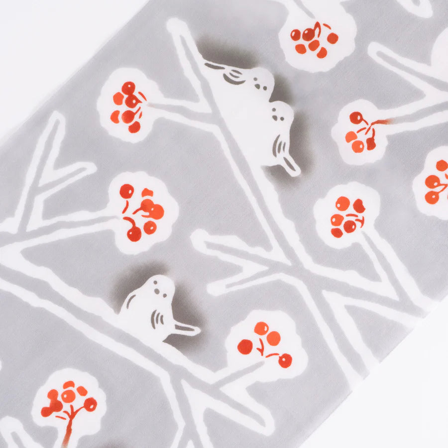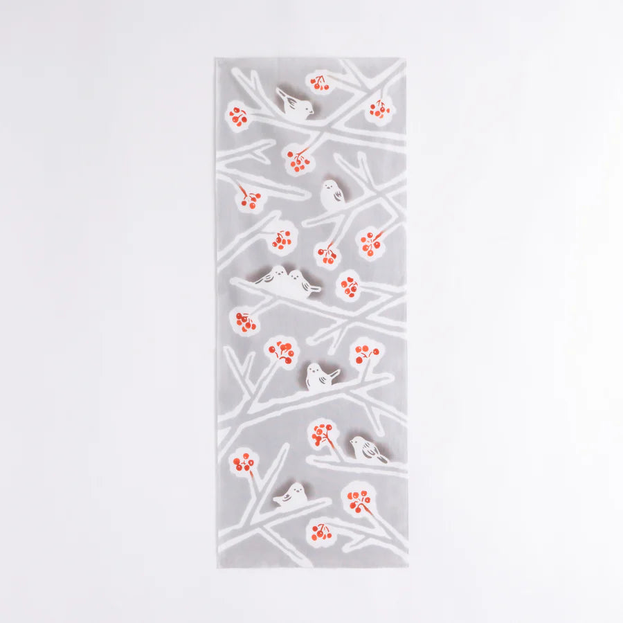 雪景色の中に「雪の妖精」ともよばれるシマエナガがさりげなく隠れています。普段使いにはもちろん、赤い実とグレーのコントラストが目を引き、飾り映えもするデザインです。
