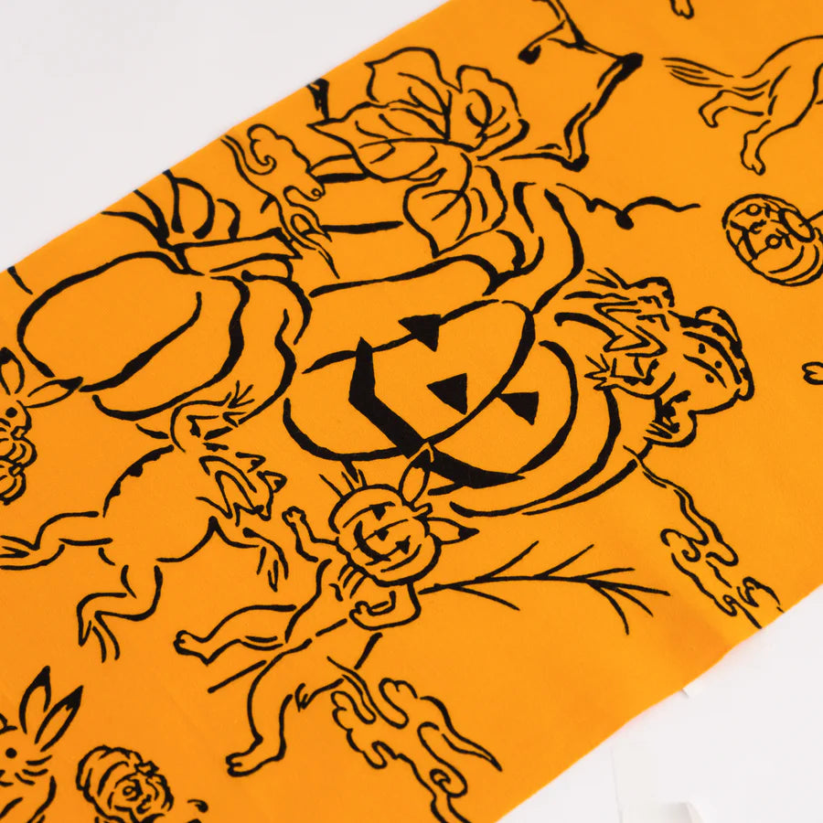 鳥獣戯画でおなじみの動物たちが、ハロウィンを陽気に楽しむ姿を描いたデザイン。かぼちゃ提灯を灯したり、お化けかぼちゃで仮装したり、その様子をひょっこり覗くガイコツも…。季節の宴を楽しむ鳥獣てぬぐいシリーズです。