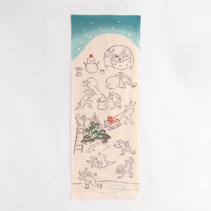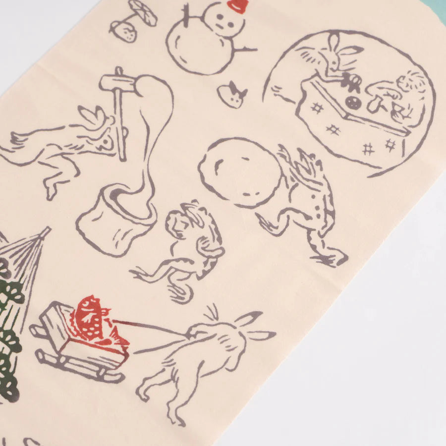 本格的な寒さを迎える前に雪つりをしたり餅つきをして冬ごもりの準備をしたり、スケートや雪遊びを楽しんだりする鳥獣戯画の動物たちが描かれています。どこか懐かしい冬ならではの暮らしをお楽しみいただけます。